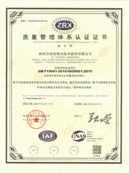 誠信,嚴謹,高效,創(chuàng)新!佳創(chuàng)視訊作為數(shù)字電視產業(yè)中擁有核心技術的領先者,將遵循國家三網融合政策,繼續(xù)研發(fā)三網融合與數(shù)字電視相關技術,不斷滿足客戶的業(yè)務發(fā)展需要,攜手促進數(shù)字電視產業(yè)的不斷進步。