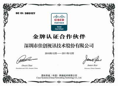 2010年12月,深圳市佳創視訊技術股份有限公司通過了美國思科(CISCO)系統有限公司的最高級別認證,正式成為CISCO金牌認證合作伙伴。此次順利通過CISCO金牌認證,標志著佳創視訊在提供數字電視整體解決方案方面的實施能力和服務水平取得新的提升。